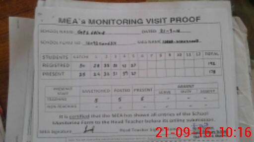 | Attendance Register | Head Teacher | MEA with School | Visit Proof |
