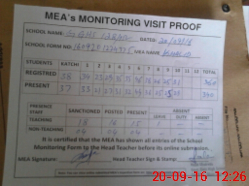 | Attendance Register | Head Teacher | MEA with School | Visit Proof |
