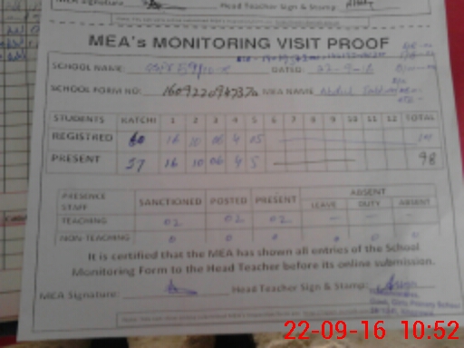 | Attendance Register | Head Teacher | MEA with School | Visit Proof |