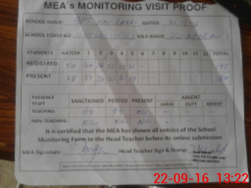 | Attendance Register | Head Teacher | MEA with School | Visit Proof |