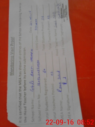 | Monitoring Date: 22-09-2016 | Start Time: 22-09-2016 08:36 AM | End Time: 22-09-2016 08:54 AM | Name of MEA: Mu**** Za**** -KP**** | |