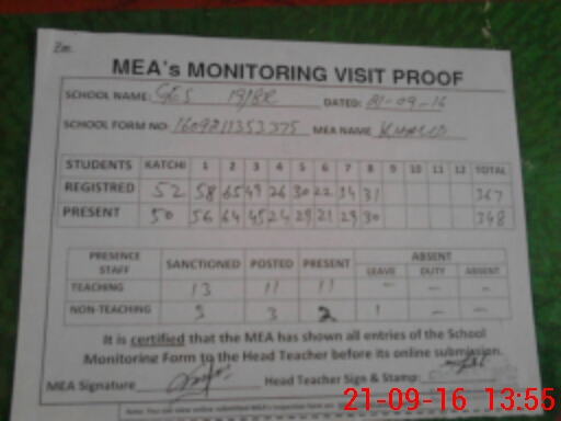 | Attendance Register | Head Teacher | MEA with School | Visit Proof |