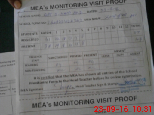 | Attendance Register | Head Teacher | MEA with School | Visit Proof |