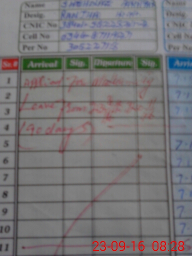 | CNIC | Full Name | Designation | R/C | Absence During Last Calender Month |