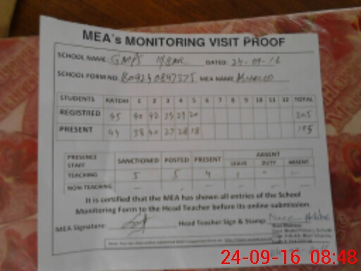 | Attendance Register | Head Teacher | MEA with School | Visit Proof |