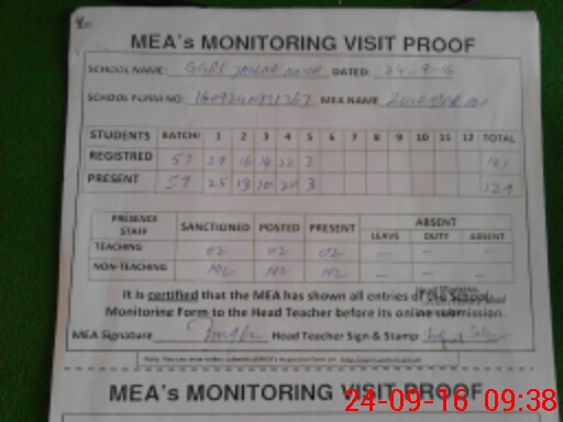 | Attendance Register | Head Teacher | MEA with School | Visit Proof |