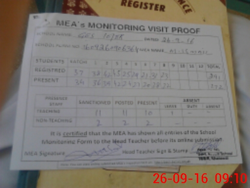 | Attendance Register | Head Teacher | MEA with School | Visit Proof |