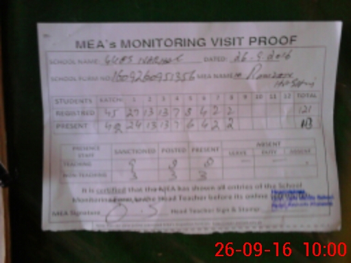 | Attendance Register | Head Teacher | MEA with School | Visit Proof |