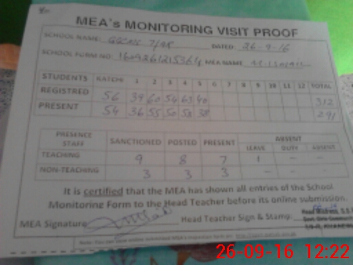 | Attendance Register | Head Teacher | MEA with School | Visit Proof |