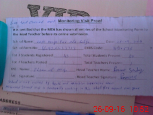 | Remarks (Use Separate Page if Required): So good School is not visited by health and nutrition supervisor ever Mohammad Ismail NQ is working temporarily for about one year | |||||