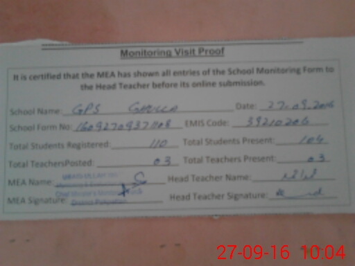 | Attendance Register | Head Teacher | MEA with School | Visit Proof |