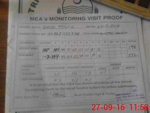 | Attendance Register | Head Teacher | MEA with School | Visit Proof |