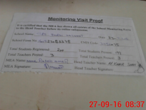 | Attendance Register | Head Teacher | MEA with School | Visit Proof |