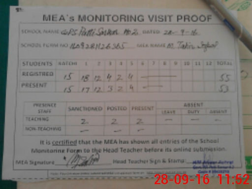 | Attendance Register | Head Teacher | MEA with School | Visit Proof |