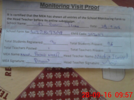 | Attendance Register | Head Teacher | MEA with School | Visit Proof |