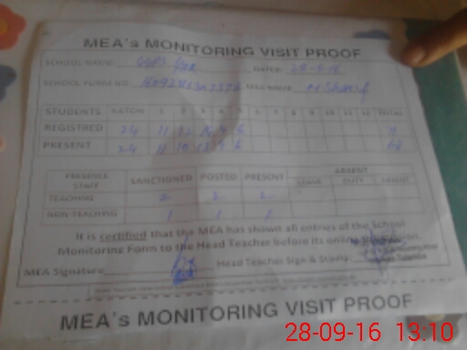 | Attendance Register | Head Teacher | MEA with School | Visit Proof |