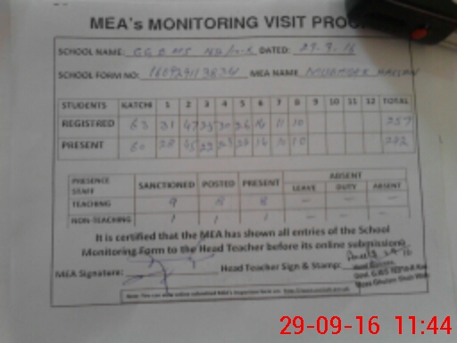| Attendance Register | Head Teacher | MEA with School | Visit Proof |