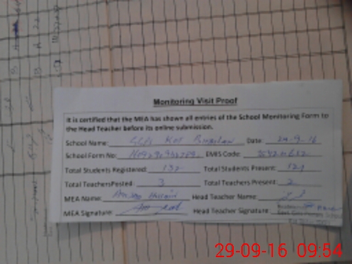 | Attendance Register | Head Teacher | MEA with School | Visit Proof |