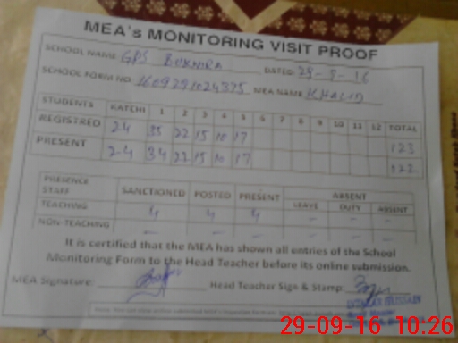 | Attendance Register | Head Teacher | MEA with School | Visit Proof |