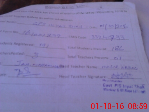 | Remarks (Use Separate Page if Required): Gps Inyat shah 33240733 u c 120 javian total sanctioned post 03 Fill post 01 and present 01 total students 191 present students 186 sir who is control them 06 classes | |||||
