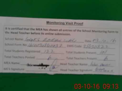| Attendance Register | Head Teacher | MEA with School | Visit Proof |