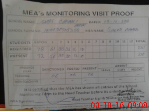 | Attendance Register | Head Teacher | MEA with School | Visit Proof |