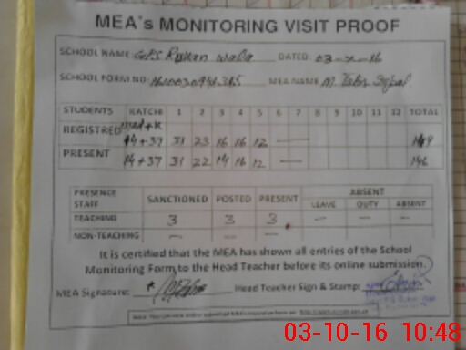 | Attendance Register | Head Teacher | MEA with School | Visit Proof |