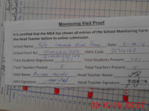 | Attendance Register | Head Teacher | MEA with School | Visit Proof |