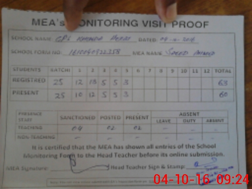 | Attendance Register | Head Teacher | MEA with School | Visit Proof |