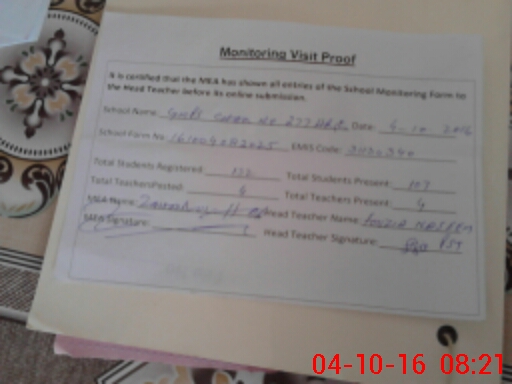 | Attendance Register | Head Teacher | MEA with School | Visit Proof |