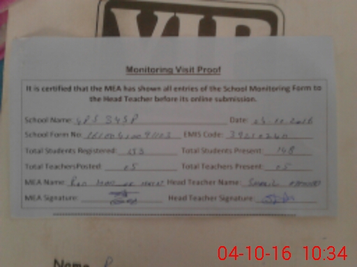 | Attendance Register | Head Teacher | MEA with School | Visit Proof |