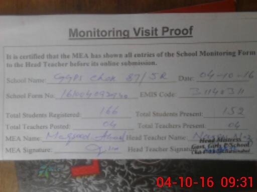 | Certified that this School was Inspected by the Undersigned MEA/DMO Today and the Information Stated Above is as Per Record. | |||||