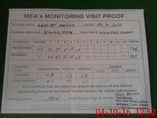 | Attendance Register | Head Teacher | MEA with School | Visit Proof |