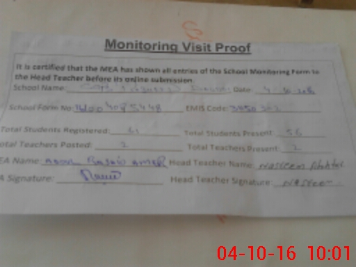 | Attendance Register | Head Teacher | MEA with School | Visit Proof |