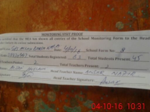 | Attendance Register | Head Teacher | MEA with School | Visit Proof |