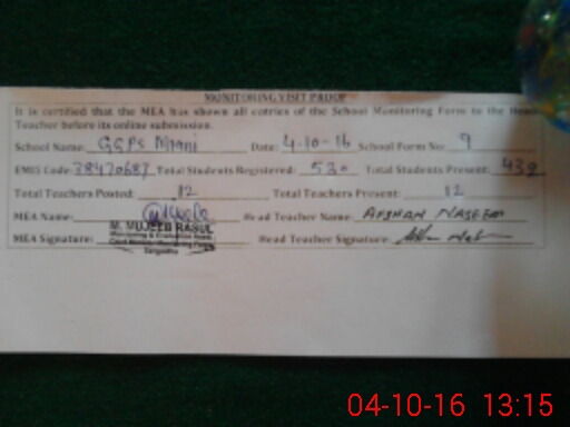 | Attendance Register | Head Teacher | MEA with School | Visit Proof |