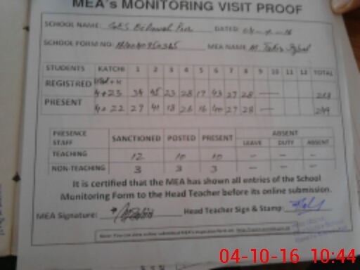 | Attendance Register | Head Teacher | MEA with School | Visit Proof |