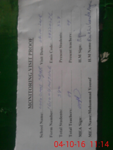 | School Visited by School Health & Nutrition Supervisor (No. of Visits) | 1 | Name1: | Hafiz Mehmood Saeed | Name2: | |