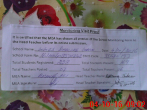 | Attendance Register | Head Teacher | MEA with School | Visit Proof |