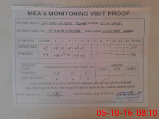 | Attendance Register | Head Teacher | MEA with School | Visit Proof |