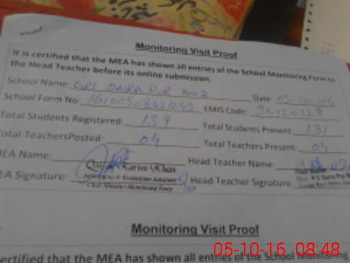 | Attendance Register | Head Teacher | MEA with School | Visit Proof |