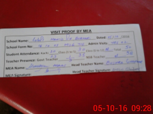 | Attendance Register | Head Teacher | MEA with School | Visit Proof |