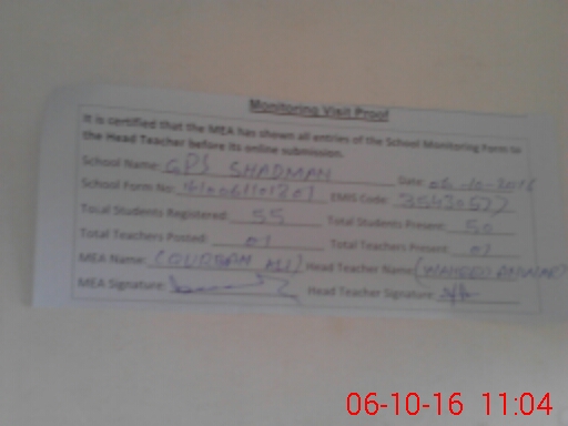 | EMIS Code: 35430577 | Name of School: GPS SHADMAN NOOR PURA | |||