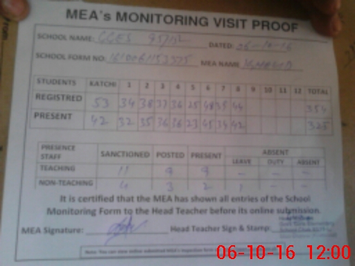 | Attendance Register | Head Teacher | MEA with School | Visit Proof |