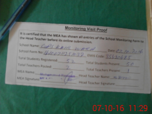 | Attendance Register | Head Teacher | MEA with School | Visit Proof |