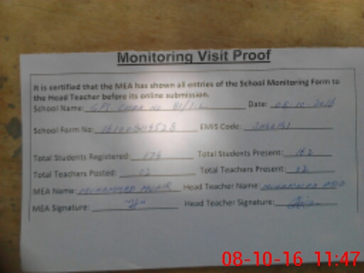 | Attendance Register | Head Teacher | MEA with School | Visit Proof |
