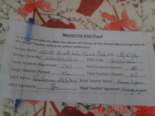| Attendance Register | Head Teacher | MEA with School | Visit Proof |