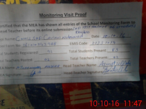 | Attendance Register | Head Teacher | MEA with School | Visit Proof |