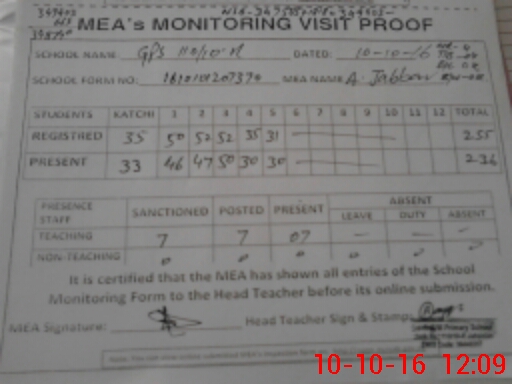 | Attendance Register | Head Teacher | MEA with School | Visit Proof |