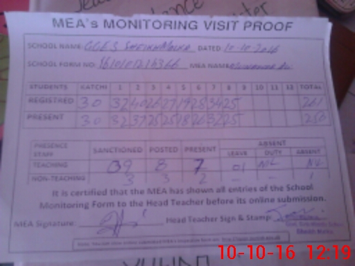 | Attendance Register | Head Teacher | MEA with School | Visit Proof |